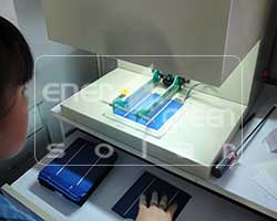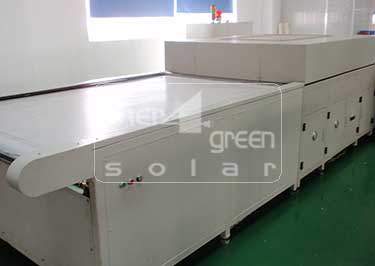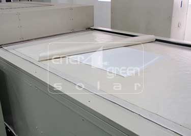 Laminator Machines: This machine laminates the panels; glass covered cells along with TPT and layers of Ethylene-Vinyl Acetate (EVA) are placed in the machine and come out perfectly laminated. Laminated panels will extend the life span of the panel as it prevents dust and moisture from entering inside the panel which would block sunlight and cause corrosion.